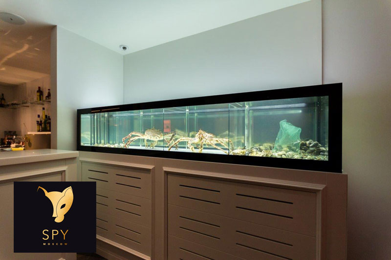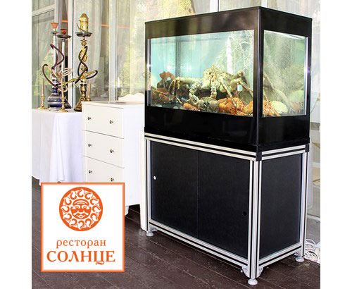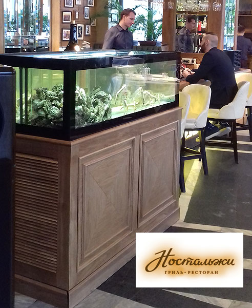 Для свежих морепродуктов нужен был аквариум в зал ресторана. Мы изготовили аквариумную систему соответствующего уровня и вписали его в интерьер. Отделка сделана из массива натурального дерева. Боковые аквариумы предназначены для устриц и моллюсков, высокий центральный - для лобстеров, крабов и лангустов.